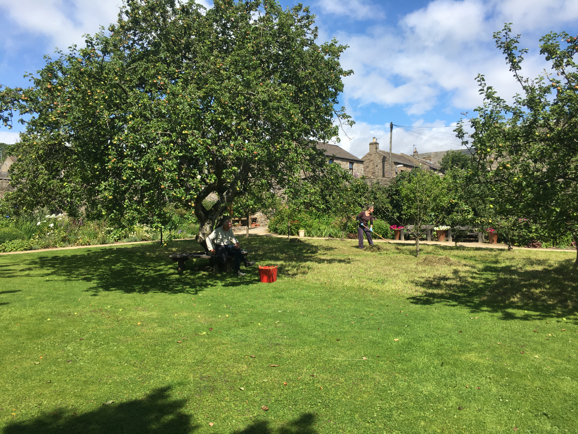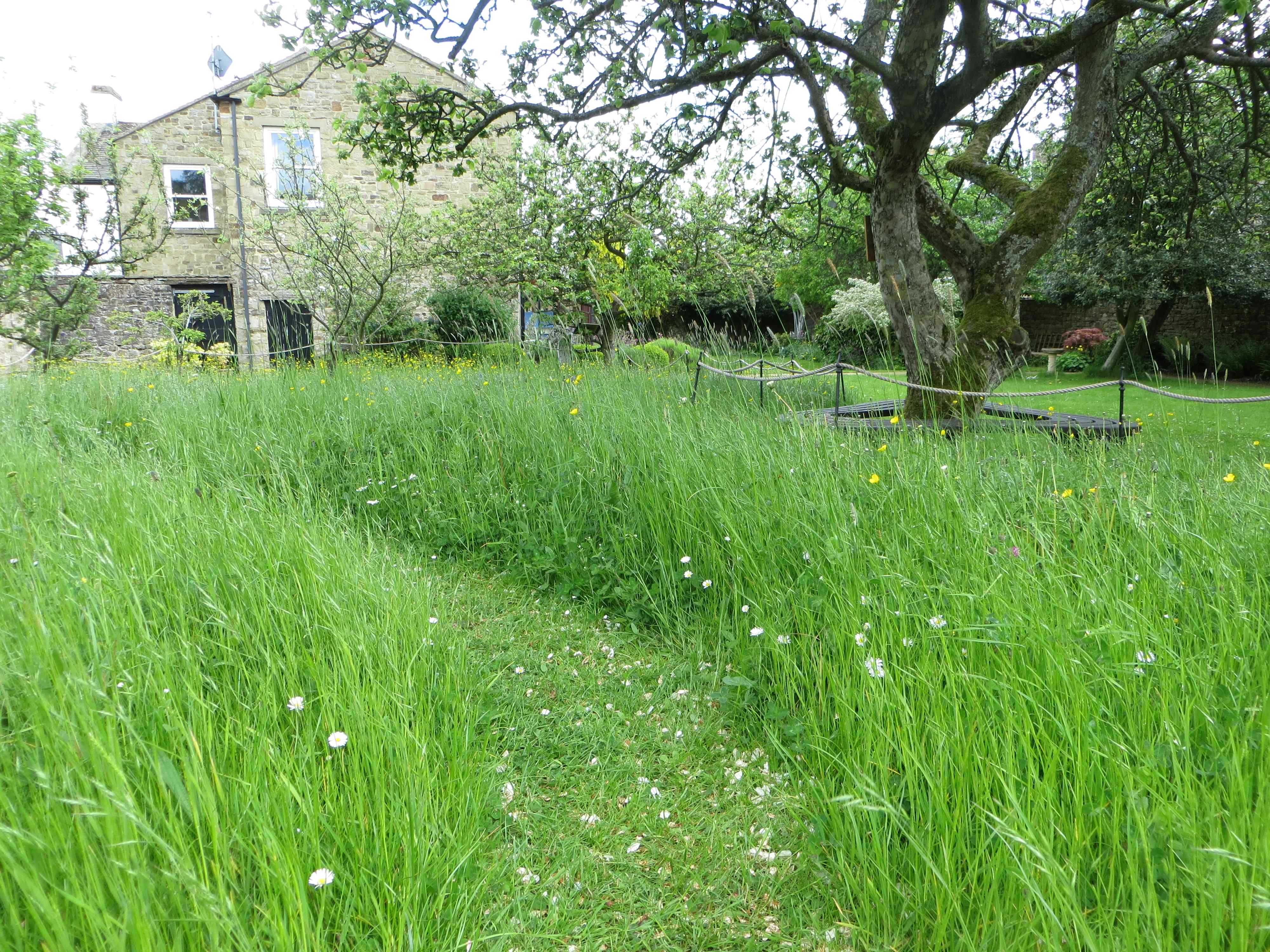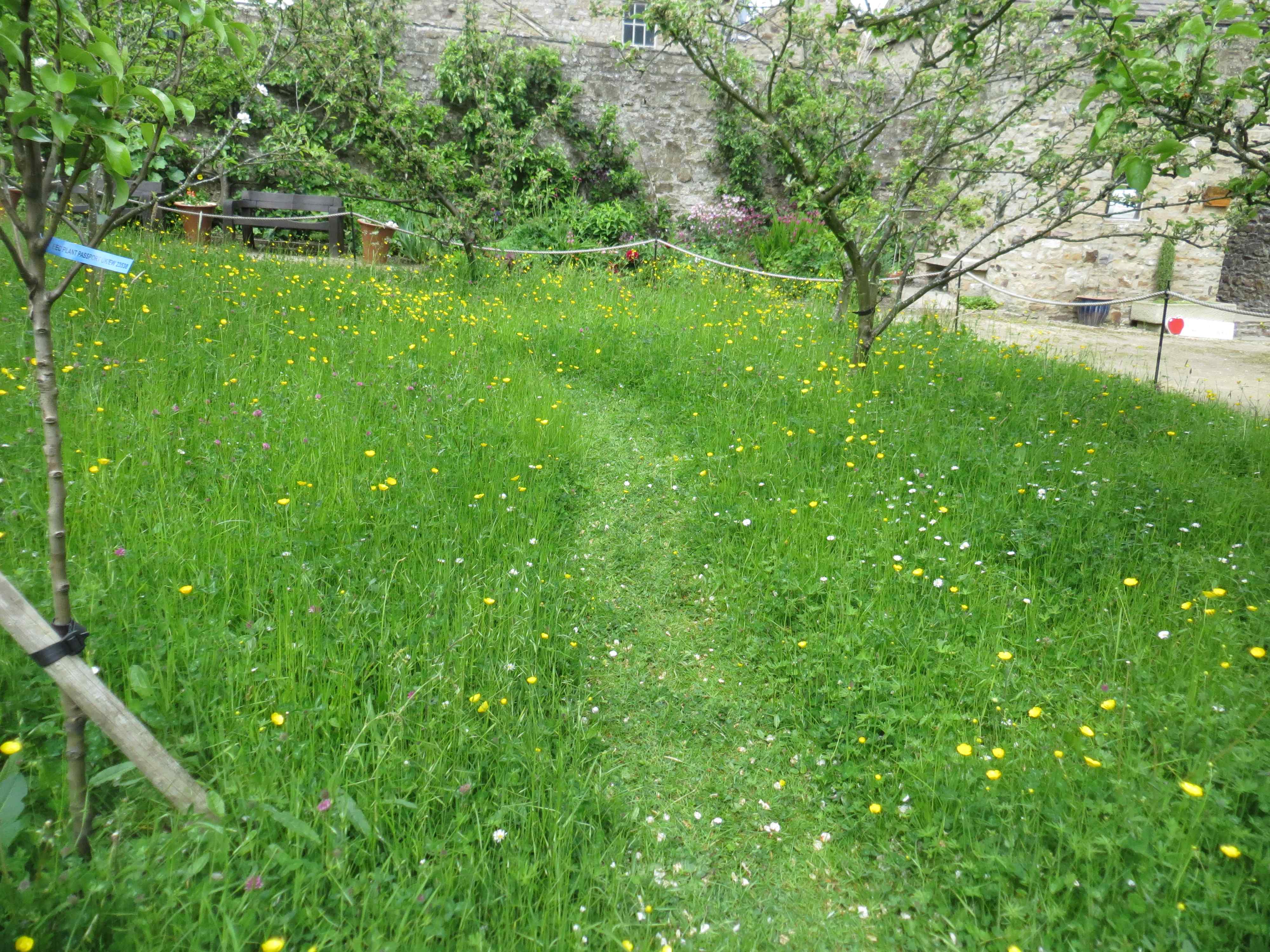 In 2002 several volunteer gardeners created a wonderful mini meadow from brush cut seed from Muker meadows, one of the main ingredients being yellow rattle plant(rhinanthus minor),a hemi-parasite which means it steals nutrients from some of the surrounding grasses, which then grow less vigorously, and leave space for more wild flowers. Yellow Rattle is an attractive yellow flower loved by the Bees, as well as a very necessary part of a successful wild flower meadow.